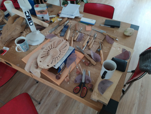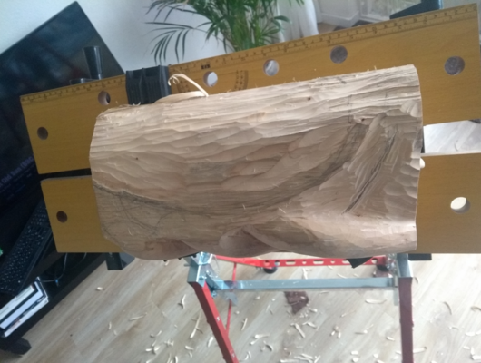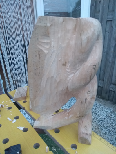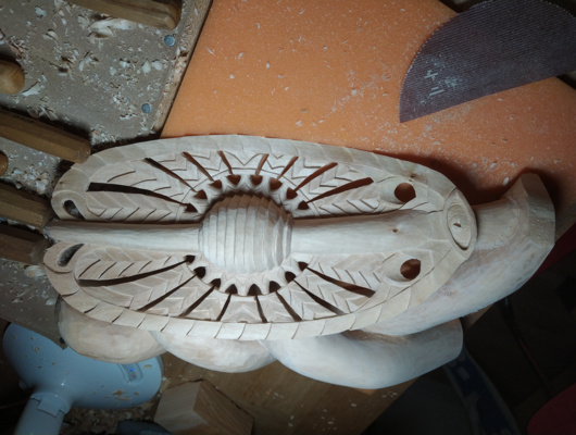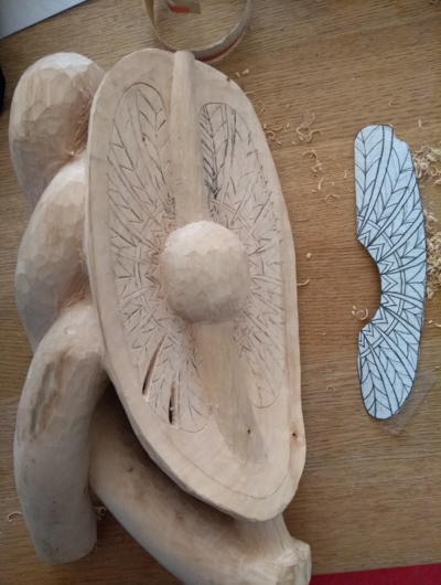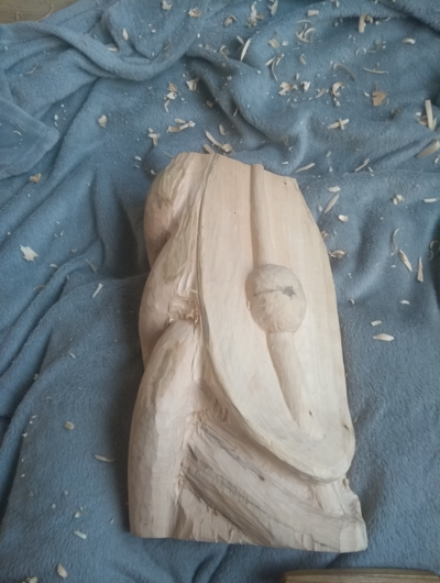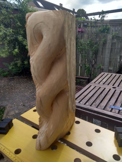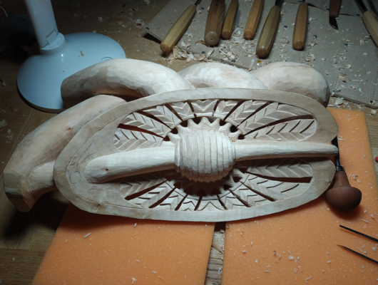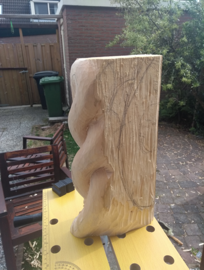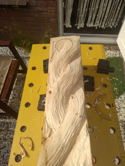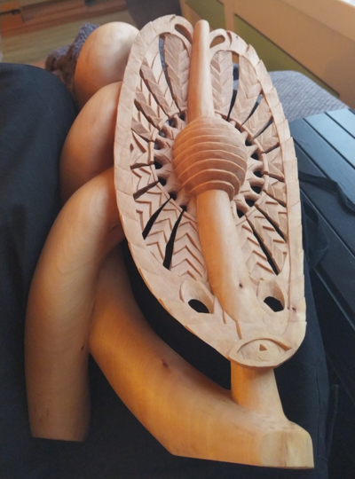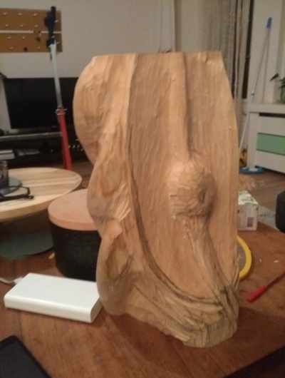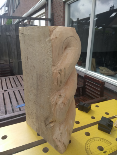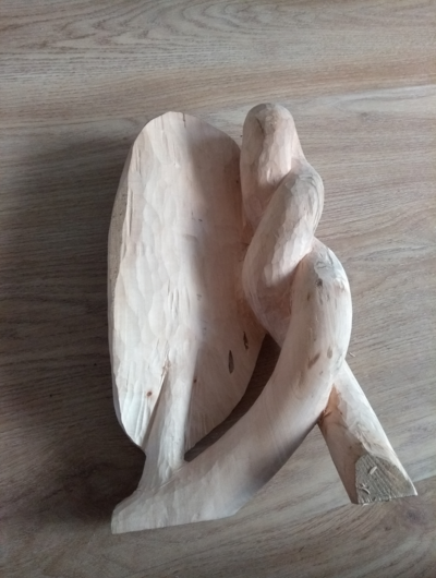 Houtsnij kunstwerk van een tak gesneden uit lindehout. Ik heb mij hier heerlijk laten meegaan door het hout en mijn handen de volle creativiteit gegeven.