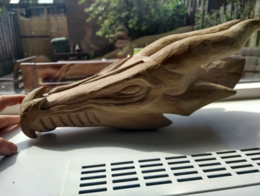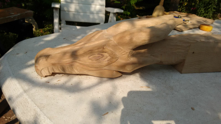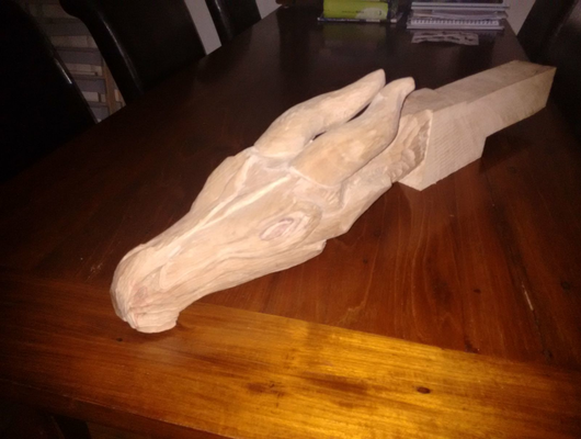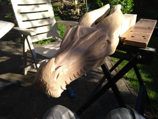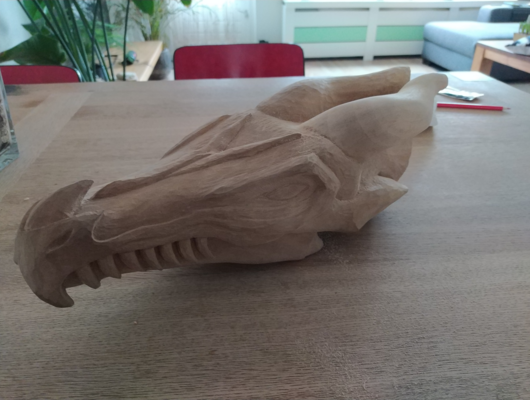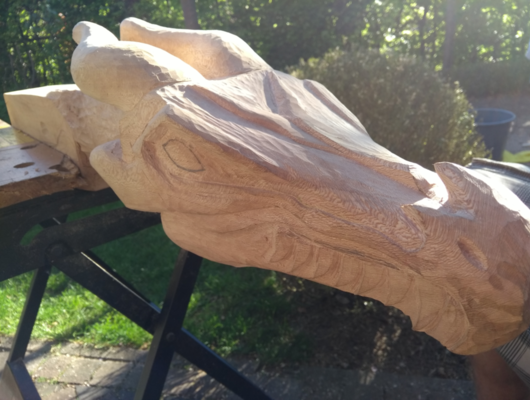 Draken hoofd van plataan hout. Ik moet deze nog steeds een keer afmaken naar meer dan 5 jaar. Het enige wat er nu nog moet gebeuren is het schuren en olien van het hout.