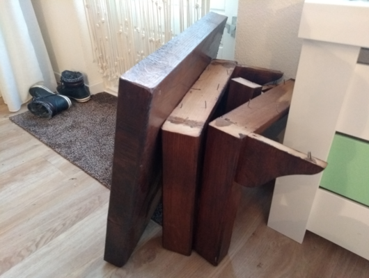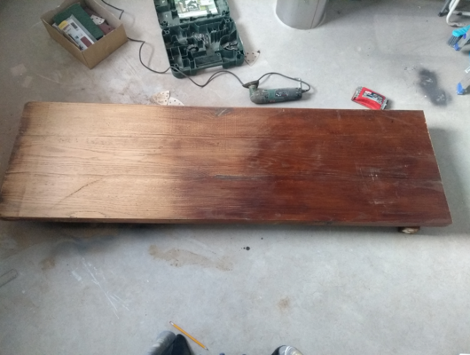 Daarna begonnen met de lak eraf schuren. Na flink wat schuren heb ik er pantserlak opgedaan. Dit behoud de kleur van het eikenhout goed en maakt het ook minder vatbaar voor krassen.