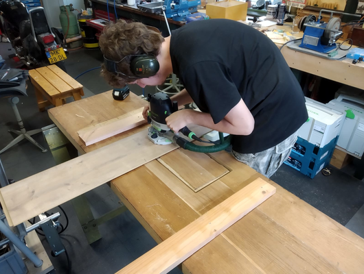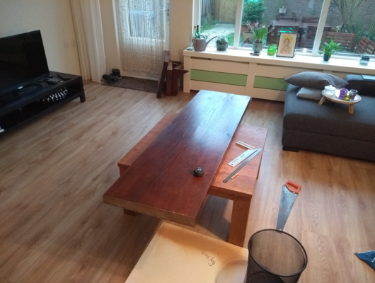 Eerst een groot stuk van de tabel afgezaagd. Het stuk wat er is afgezaagd zal gebruikt worden voor iets anders.