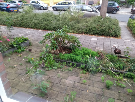 Een foto van de voortuin uit 2019. Hier is goed te zien hoe de tuin niet onderhouden is. Er is veel onkruid tussen de tegels gaan groeien. De eenden uit de buurt hadden er gelukkig wel pret mee. Ik heb destijds tweemaal het onkruid verwijderd maar eigenlijk had daar ook weinig zin in omdat ik het maar een oninteressante tuin vond.