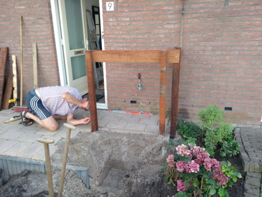 Het maken van de pergola hebben we geen foto's. Maar wel toen die net stond. Eerst hebben we diepe gaten gemaakt met de grondboor. Daarna hebben we de palen de grond in geslagen met een moker, waterpas gezet en goed aangestampt. Tenslotte hebben we de balken aan de bovenkant vast gemaakt met RVS schroeven.