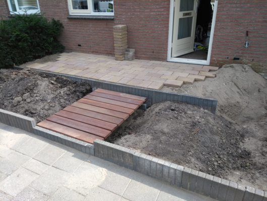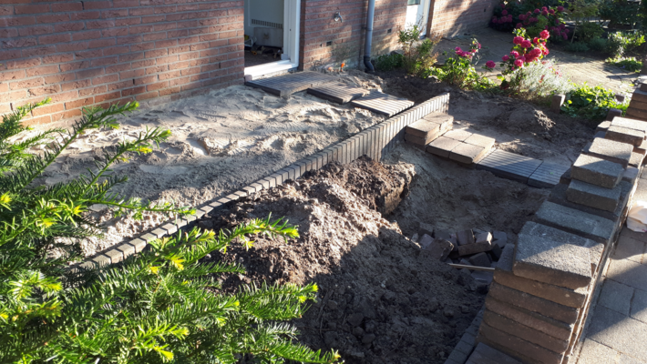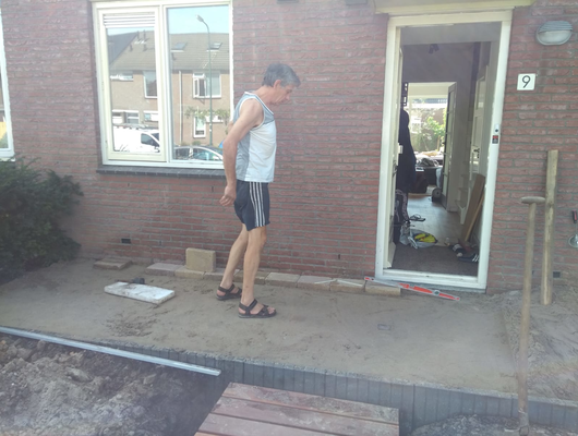 Op deze dag hebben we de tegels van het toegangspad eruit gehaald en de rest van de opsluitbanden neergezet. Ook hebben we het een begin gemaakt aan het zandbed voor de bestrating. Voor een tijdelijke toegangspad hebben we een paar opsluitbanden neergelegd.