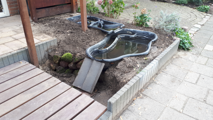 De vijver hebben we op Marktplaats gevonden voor €25 inclusief de waterval. De vijver staat een klein beetje gekanteld naar de wadi toe. Dit om ervoor te zorgen dat het water uit de vijver overspoeld in de wadi. Echter na een test met het water uit de tuin slang ging dit nog niet helemaal goed.
