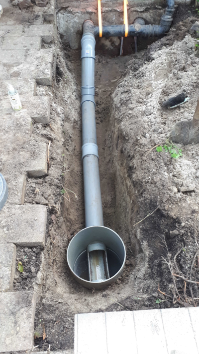 In deze foto is de nieuwe riolering goed te zien. Het riool gaat vanuit het huis naar het eerste "knie" hulpstuk naar een buis van ongeveer 40cm. Deze knie is niet gelijmd maar heeft een schuifmof aansluiting. Daarna gaat de buis weer in hetzelfde soort knie hulpstuk naar de inspectieput. Omdat we de rioolpijp niet gelijmd is kan er wat speling onstaan in het geval de grond verder zakt.