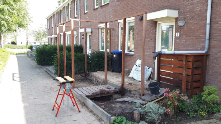 Ook wou ik de papier en gft bakken in de voortuin zetten achter een hek zodat deze vuilnisbakken minder ruimte innemen in de achtertuin. Toen kwam mijn vader ook met het idee om een pergola te maken zodat daarin een blauwe regen kan groeien en andere klimplanten.