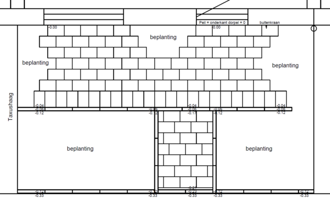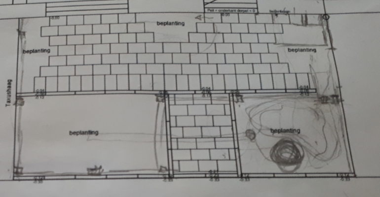 Elk project begint met een plan. Voor een aantal praktische redenen is het handig om een tekening te maken en te kijken wat er allemaal nodig is. De maten die we eerder hadden gemeten heeft mijn vader in een digitale tekening gezet en heeft daarmee de eerste versie van het ontwerp gemaakt. Gezien de tegels in de voortuin nog goed en mooi zijn hebben we besloten om deze tegels opnieuw te gebruiken. Ook de opsluit banden konden we goed hergebruiken.