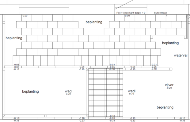 Mijn vader heeft de schets verwerkt in de in de digitale tekening. Toen kreeg kwam het idee om het toegangspad te vervangen door een brug. Onder de brug is een wadi (Water Afvoer Door Infiltratie). Een wadi is een kuil in de grond waarin het water loopt als het regent. Daarna zakt het water weer vlot de grond in. Dit was een geweldige oplossing voor het probleem van het overtollige water uit de vijver bij hoosbuien. En het zal er nog een mooier uitzien ook.