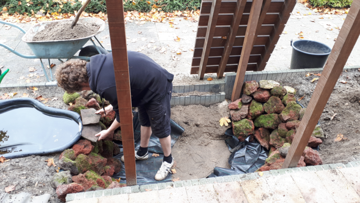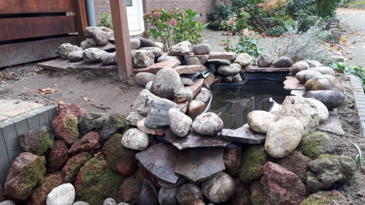 Voor de decoratie van de vijver en de wadi hebben we een speurtocht gedaan op Marktplaats en hadden we lavastenen en rivierstenen gevonden. Deze konden we gratis ophalen.